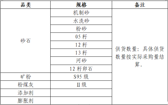 本次征集活動為2024年度第一次原材料供應商的征集,征集供應商品類為:砂石、水泥、粉煤灰、礦粉、膨脹劑、減水劑、外加劑等,現(xiàn)每年總需求約200萬噸。